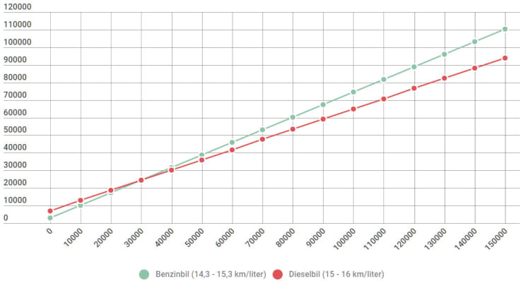 I den ovenstående graf er prisen for en benzinbil, der kører 10-10,4 kilometer på literen blevet sammenlignet med en dieselbil, der kører 9,4-10,1 kilometer på literen. I sammenligningen fremgår det tydeligt, at benzinbilen umiddelbart er den billigste.